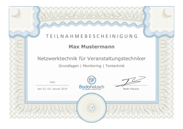 Doch wer vermittelt jetzt dieses Wissen? Eine mehrjährige Ausbildung zum Netzwerkadministrator erscheint hier nicht zielführend! Leider sprechen diejenigen, die sich perfekt mit Netzwerktechnik auskennen, meist eine andere Sprache als Veranstaltungstechniker, da ihr Arbeitsbereich ein völlig anderer ist. Diesem Umstand wird Rechnung getragen, indem die Kenntnisse auf Augenhöhe anschaulich vermittelt werden. Der Praxisbezug zum Arbeitsalltag von Ton-, Licht- und Videotechnikern steht hierbei stets an höchster Stelle.